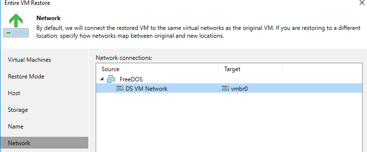 - In the Next step, select the network to which the VM should be a connected to and complete the restore.