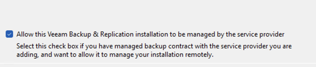 The most important checkbox during this addition is “Allow this VBR installation to be managed by the service provider.” This enables the installation to be managed remotely by the VSPC.