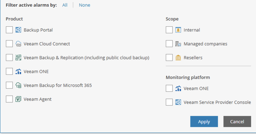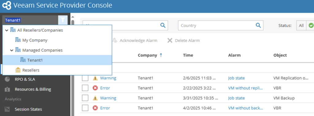 Service providers can also change the scope of the entire service provider console portal to a specific tenant and view the alarms that are specific to this one particular customer. This feature can also be used by tenants themselves by logging into the service provider console (if the service provider enabled public access of VSPC) to check for any active alarms in their environments.